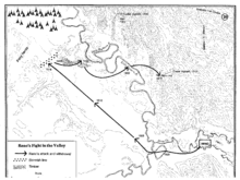 By almost all accounts, the Lakota annihilated Custer's force within an hour of engagement.[45][46][47] David Humphreys Miller, who between 1935 and 1955 interviewed the last Lakota survivors of the battle, wrote that the Custer fight lasted less than one-half hour.[48] Other Native accounts said the fighting lasted only "as long as it takes a hungry man to eat a meal." The Lakota asserted that Crazy Horse personally led one of the large groups of warriors who overwhelmed the cavalrymen in a surprise charge from the northeast, causing a breakdown in the command structure and panic among the troops. Many of these men threw down their weapons while Cheyenne and Sioux warriors rode them down, "counting coup" with lances, coup sticks, and quirts. Some Native accounts recalled this segment of the fight as a "buffalo run."[49]