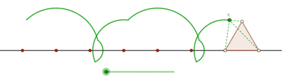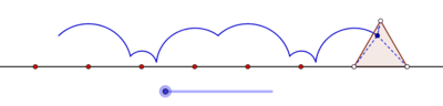 ![]() Animation showing the generation of one arch of a cyclogon by an equilateral triangle as the triangle rolls over a straight line without slipping. | ![]() Animation showing the generation of one arch of a cyclogon by a square as the square rolls over a straight line without slipping. |
