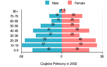 According to the 2002 Poland census, there were 582 people residing in Czajków Północny village, of whom 51% were male and 49% were female. In the village, the population was spread out with 28% under the age of 18, 38% from 18 to 44, 18.9% from 45 to 64, and 15.1% who were 65 years of age or older.[1]