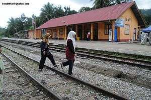 ![]() Two women crossing the railway tracks near Dabong railway station | |||||||||||