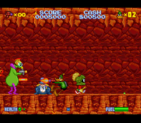 Shrinking rays and crushing platforms are commonly seen as the player tries to kill Martians that are standing in the way along with rock monsters and dragons. Lava won't instantly kill the player's character but falling into a bottomless pit will. In the end, Marvin the Martian must be destroyed in the final stage of the game.[6]