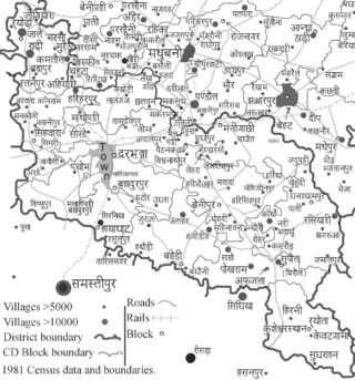Darbhanga district (Hindi: दरभंगा जिला , دربھنگہ ضلع ) is one of the thirty-eight districts of Bihar state in eastern India, and Darbhanga city is the administrative headquarters of this district and a big city of Bihar as well. Darbhanga district is a part of Darbhanga Division. The district is bounded on the north by Madhubani district, on the south by Samastipur district, on the east by Saharsa district and on the west by Sitamarhi and Muzaffarpur districts. The district covers an area of 2,279 km².