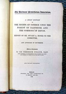 - 1 2 3 Moore, Stuart A. A short history of the rights of common upon the Forest of Dartmoor and the commons of Devon. Dartmoor Preservation Association, Plymouth, 1890. ISBN 0950138649.