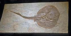 | Fossil of Dasyatis muricata from Monte Bolca, 50 million years ago, on display at the Museo Civico di Storia Naturale di Milano | |