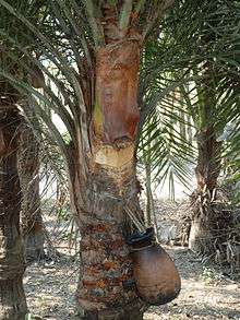 In large parts of Northern India the local species of wild date palm, Phoenix sylvestris, is tapped for palm wine, while in Bangladesh, Pakistan and other countries in the region it is now mostly tapped for jaggery and palm syrup production. Wild date palms are also tapped in large parts of Africa for palm wine. The process of palm tapping involves the cutting of the unopened flower stalk and then fastening a bottle gourd, clay or plastic vessel on to it. The palm sap then collects in the vessel and is harvested in the early morning hours. If a few drops of lime juice are added to the palm sap, fermentation can be stopped and the sap can then be boiled to form palm syrup, palm sugar, jaggery and numerous other edible products derived from the syrup. In India and Pakistan, North Africa, Ghana, and Ivory Coast, date palms are tapped for the sweet sap, which is converted into palm sugar (known as jaggery or gur), molasses or alcoholic beverages. In North Africa the sap obtained from tapping palm trees is known as lāgbī. If left for a sufficient period of time (typically hours, depending on the temperature) lāgbī easily becomes an alcoholic drink. Special skill is required when tapping the palm tree so that it does not die.