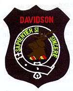 While at Killarney Heights High School in 1972, the parents of the first students were granted permission by the Lairds of the Clan Davidson to use the crest, shield and tartan of Clan Davidson of Tulloch.[5] The distinctive tartan colours and the stag's head were incorporated in the badge, and are still used as part of the uniform. The Clan Davidson and subsequently Davidson High Motto - 'Sapienter si Sincere' - means 'Wisely if Sincerely' or alternately, 'with wisdom if with sincerity'.[5]