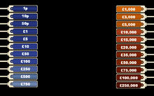 There are 22 cash prizes contained in the boxes on the programme. These cash prizes range from 1p to £250,000. The highest five valued boxes are referred to as the "Power Five",[4] whilst the lowest five valued boxes are referred to as the "Banker's Power Five".[4]