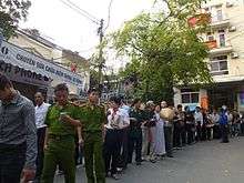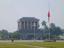 Upon acknowledging General Giáp's death, the government announced plans for a national funeral to be held on October 12 and 13. The Funeral Committee consisted of 30 people, headed by General Sectetary Nguyễn Phú Trọng.[13] The National Funeral Arrangements Committee, headed by deputy prime minister and Politburo member Nguyễn Xuân Phúc, was tasked with making the arrangements for the funeral and burial ceremonies. General Giap's body lied in state at the National Funeral Hall, where mourners could pay their respect beginning on October 12. While the main ceremony took place in Hanoi, simultaneous memorials were also held at the Reunification Palace in Ho Chi Minh City and the Provincial People's Committee Office in Quảng Bình, his home province. Immediately after the funeral ceremony on October 13, his body was flown to Quảng Bình, where he was buried in Vũng Chùa - Đảo Yến, a location near the coast.[14] As his resting place is at a remote location, workers had to work quickly to pave the road to facilitate the burial.[15]