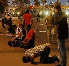 When the shooting stopped, about fifty protesters[29] started praying on the road,[21] and few stood in front facing the army with their hands in the air.[30] The army opened fire for a third time.[1]:78[21][26][31] The period of each shooting was short, because "people immediately started running away", witnesses said.[22][26] After that, riot police intervened, firing tear gas and birdshot to disperse protesters, inflicting more injuries among them.[1]:78[32]