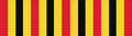 The medal is suspended by a ring through the suspension loop to a silk moiré ribbon of seventeen alternating longitudinal stripes of red, yellow and black. A gilt inverted metal chevron is affixed to the ribbon of the award first class.