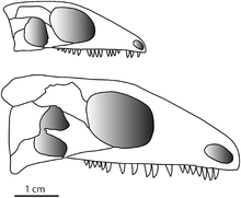 The type species D. priscus is known from the holotype KU 11117, a fragmentary left maxilla bearing 4 teeth, and from the fragmentary referred specimens KU 11118 and KU 11119, a right and a left maxillae respectively, each bearing 4 teeth. All known specimens of D. priscus are housed at the University of Kansas Natural History Museum in Lawrence, Kansas.[1] Unlike the type species, D. cifellii is known from a well-preserved partial subadult skeleton, an isolated adult skull, and other disarticulated elements, all housed at the Oklahoma Museum of Natural History. The subadult individual preserves both the partial skull and the postcranial remains in articulation, and thus was chosen as the holotype, represented by OMNH 73515. OMNH 73362 represents the complete skull of the large, adult, individual. Other remains referred to D. cifellii include OMNH 73363, a complete right mandibular ramus of an individual equal in size to OMNH 73362, as well as the right maxilla OMNH 73524.[2]