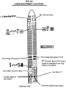 Once the aircraft stopped, the first officer attempted to contact the tower; however, he was unable due to the cockpit's lack of power. The flight crew then activated emergency power, contacted Pensacola tower, and declared an emergency. The cockpit's jump-seat passenger, an off-duty Delta Boeing 767 pilot, went to inspect the rear of the aircraft. When the first officer saw the over-wing exits open and about half of the passengers missing along with hearing engine noise, he returned to the cockpit and advised the captain to kill the engines. At 2:27 pm CDT the pilot requested emergency medical assistance due to the jump-seat passenger's report of a large hole in the fuselage, engine debris throughout the cabin, and injured passengers. He then reported there was no evidence of smoke or fire in the cabin, and that the rear cabin door had been opened and the emergency slide was inflated. The flight attendant who initiated the evacuation through that door told the NTSB that she saw fire on the left engine and therefore abandoned evacuation through that door and directed passengers forward. She reported that there were many injuries and possibly two dead, and that therefore she began to evacuate the plane until she was stopped by the first officer. Due to the damage to and danger at the rear of the aircraft, the air stairs built into the MD-88 were found unsuitable to use. The captain then requested portable air stairs to deplane passengers, which arrived 25 minutes later.[3]