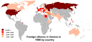 - ↑ Πίνακας 9. Πληθυσμός κατά υπηκοότητα και φύλο - Σύνολο Ελλάδος, αστικές και αγροτικές περιοχές - Απογραφή πληθυσμού της 18ης Μαρτίου 2001 [Table 9. Population by nationality and sex - Total for Greece, urban and rural areas - Census of 18 March 18, 2001] (PDF). Census (in Greek). www.statistics.gr. 2001. Archived from the original (PDF) on 6 February 2009. Retrieved 7 January 2009.