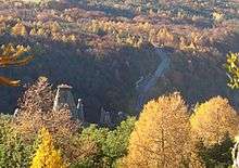 The Demoiselles Coiffées de Pontis is a rock formation in Pontis, near Embrun in the French Alps, located on the edge of the Lac de Serre-Ponçon. The formation consists of a number of hoodoos, described as a "set of narrowly-tapered rock columns....topped with a large rock balanced neatly on the tip."[1] In French, such structures are referred to as Demoiselles Coiffées ("ladies with hairdos").