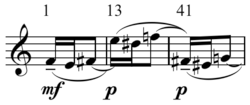 Defined by the head motif and its repetition in bar 3, is "characterized by its relative pitch content (a three-note segment of the semitonal scale), by its interval order—down a half step and up a whole step—and by its rhythm (two sixteenth-notes on the beat followed by a tied eighth-note). This definitive version of the motive, combining all three attributes, occurs at only three different points (not counting the repetition in bar 3), each initiating a new and major formal subdivision of the piece." (Perle, 1990)