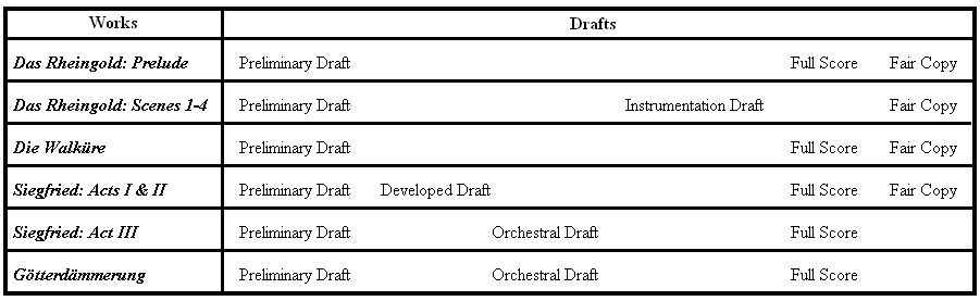 - Preliminary Draft (Gesamtentwurf) – the first complete draft in pencil (later traced over in ink) of the entire work (in the case of the first two Ring operas) or of an entire act (in the case of the last two). There is generally only one vocal stave and one or two instrumental staves. Instrumental interludes are sometimes elaborated on three staves. The preliminary draft for Das Rheingold was similar in detail to the one Wagner composed for Lohengrin, but those of the following three Ring operas were as detailed as Lohengrin's second complete draft (the so-called "composition draft").