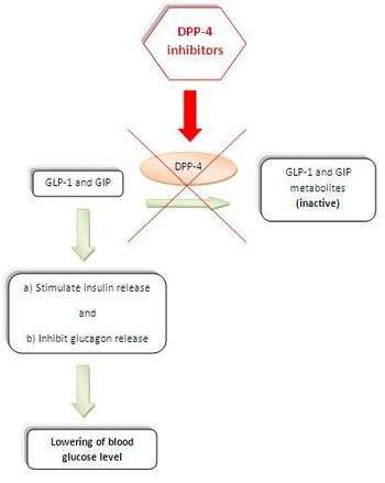GLP-1 and GIP have extremely short plasma half-lives due to very rapid inactivation, catalyzed by the enzyme DPP-4. Inhibition of DPP-4 slows their inactivation, thereby potentiating their action, leading to lower plasma glucose levels, hence its utility in the treatment of type 2 diabetes. (Figure 1).[2][7]