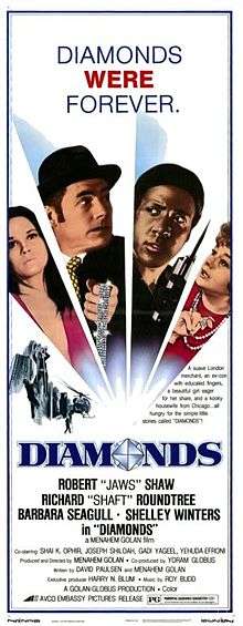 Diamonds is a 1975 Israeli-American heist film. Robert Shaw stars in a dual role as twin brothers. Richard Roundtree, Barbara Hershey and Shelley Winters are co-stars. The film was also released as Diamond Shaft, although it has no relation to the Shaft films other than having Roundtree in the cast.