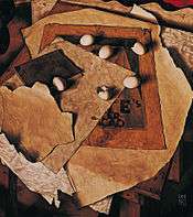 His meticulously composed and rendered still lifes feature favorite objects such as bottles, an empty bowl, eggs, and musical instruments. Ket juxtaposed these objects in angular arrangements, seen from a high vantage point, their cast shadows creating emphatic diagonals. These compositions reveal the influence of cubism as filtered through the posters of Cassandre, which are frequently depicted in Ket’s paintings. Another source of inspiration came from early Netherlandish painting, which Ket admired for its atmosphere of austere reverence that he called its quality of "intrusiveness".[3]