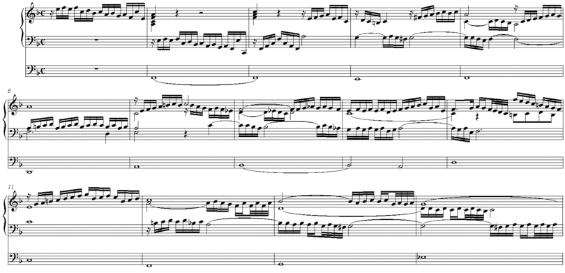 Example 1: This is the introduction from Prelude in F major, BuxWV 145. The motivic interaction seen here, in which a short motif is passing from one voice to another, sometimes sounding in two voices simultaneously, was frequently employed by Buxtehude in his preludes, frequently expanded to four voices with heavy use of pedal.