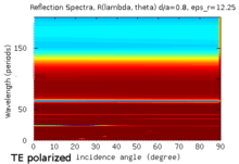 For TE and TM incidence we have the reflection spectra of a DBR stack, corresponding to a 6 layer stack of dielectric contrast of 11.5, between an air and dielectric layers. The thicknesses of the air and dielectric layers are 0.8 and 0.2 of the period, respectively. The wavelength in the figures below, corresponds to multiples of the cell period.