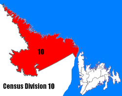 Census Division No. 10 is composed of the area of the province of Newfoundland and Labrador, Canada, called Labrador outside Nunatsiavut. It has a land area of 269,073.3 km² (103,889.78 sq mi) and at the 2011 census had a population of 24,111.[1] Its two major population centres are the towns of Happy Valley-Goose Bay and Labrador City.