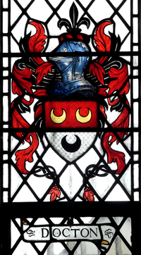 Docton is an historic estate in the parish of Hartland in Devon. The former "mansion house"[3] situated 3 miles south-west of the village of Hartland was the residence of the Docton (originally de Docton) family from the 15th century. Today the estate having been split-up comprises separate holdings of Docton Farm,[4] a working farm which operates holiday-let cottages including Waterwheel Cottage, Old Granary Cottage and Old Millhouse Cottage. Docton Mill,[5] the estate's former corn mill, is now operated as award winning tea-rooms with a garden open to the public. The arms of the Docton family were: Per fess gules and argent, two crescents in chief or another in base sable.[6] These may be seen, amongst other places, in a 1933 stained glass window in St Nectan's Church, Hartland, by Townshend and Howson and on the ledger stone to Phillipa Cary (1603-1633) in Clovelly Church.