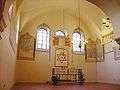 The building, designed in Baroque style, has rectangular ground plan and two floors. At the half of 19th century new tract was added and used to extends tribune for women.