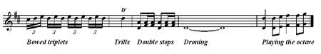 The Donegal style of fiddling is a label often applied to music from this area, though one also might plausibly identify several different, but related, styles within the county.[10] To the extent to which there is one common style in the county, it is characterised by a rapid pace; a tendency to be more un-swung in the playing of the fast dance tune types (reel and jigs); short (non-slurred), aggressive bowing, sparse ornamentation, the use of bowed triplets more often than trills as ornaments, the use of double stops and droning; and the occurrence of "playing the octave", with one player playing the melody and the other playing the melody an octave lower. None of these characteristics are universal, and there is some disagreement as to the extent to which there is a common style at all. In general, however, the style is rather aggressive.[1]