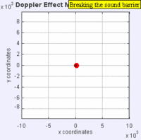 Now the source is moving at the speed of sound in the medium (υs = c). The wave fronts in front of the source are now all bunched up at the same point. As a result, an observer in front of the source will detect nothing until the source arrives where