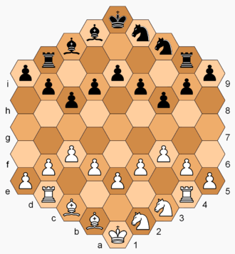Dragonfly (also known as Shuttle Chess or Bird Chess) is a chess variant invented by Christian Freeling in 1983.[2][3][4] There are no queens, and a captured bishop, knight, or rook becomes the property of the capturer, who may play it as his own on a turn to any open square. The board is 7×7 squares, or alternatively a 61-cell hexagon with two additional pawns per side.