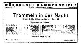 Drums in the Night, a "Comedy in Five Acts by Bertolt Brecht", was given its premiere at the Munich Kammerspiele, opening on 29 September 1922. Otto Falckenberg - head of the Kammerspiele and renowned champion of new, controversial dramas in Weimar Germany - directed, set-design was by Otto Reigbert, and the cast included Erwin Faber (as a Guest from the National Theatre of Munich, the Residenztheater) in the main role of Andreas Kragler, Max Schreck (as Glubb), Hans Leibelt, Kurt Horwitz and Maria Koppenhöfer.