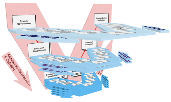 For simplicity of illustration, only one entity vee is shown intersecting the architecture vee at each decomposition level. Note that the design-to sequence is top down, starting at the system level and proceeding consistent with decomposition to the lowest configuration item level (LCI). This sequence ensures that there is proper top down requirements flowdown and traceability.