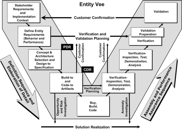 At each elaboration, there is a direct correlation between activities on the left and right legs of the Entity Vee. Again this is deliberate. The method of verification to be used on the right Vee leg must be defined as requirements are developed on the left, otherwise requirements might be created that could not be verified. For example "user friendly" is a valid requirement, but it is unverifiable. Instead, a requirement that a computer screen display have "no more than five lines of 14-point text" defines one user's view of "user friendly" in measurable terms. Verification plans should be baselined to ensure verification requirements and methods are known and planned for at the design-to decision gate, commonly called Preliminary Design Review (PDR). Draft verification procedures based on the verification requirements, verification plan, and proposed entity design should be available at the build-to and code-to decision gate, commonly called critical design review (CDR). This reduces the chances that verification as specified cannot in fact be performed.