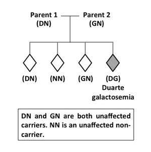 Duarte galactosemia is inherited as a Mendelian autosomal recessive trait. A child with DG carries two different types of GALT alleles, one inherited from each parent. One of these GALT alleles, the G allele, carries a mutation that severely inhibits the function of the encoded GALT enzyme. The other GALT allele, the D or D2 allele, carries mutations that partially compromise the expression and change some biochemical properties of the GALT enzyme. Together, the G and D alleles only produce about 25% of the normal level of GALT enzyme activity found in a person with two normal (N) GALT alleles.[1] Both parents of a child with DG are considered carriers for GALT variant alleles: one carries the G allele and the other carries the D allele. The genotypes of these parents would be written GN and DN, respectively. Without follow-up testing of the parents it is not possible to know which parent contributed which GALT allele to a child with DG. The recurrence risk for DG is 1 in 4, meaning that for each successive child born to parents who already have a child with DG there is a 1 in 4 chance the new baby will also have DG (Figure 2). In rare cases, one parent may actually have DG but not know it, while the other parent is a carrier for a G allele (GN). For these couples, there is a 1 in 4 recurrence risk for DG and also a 1 in 4 risk with each pregnancy that the new baby will have classic galactosemia. In extremely rare cases a GALT mutation may arise de novo, so that only one parent is a carrier; however, only one case of this has ever been reported.[8]