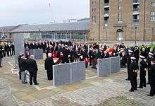 Dundee International Submarine Memorial was dedicated on 17 September 2009.[5] It commemorates the crews who are "Still on Patrol" and honours the gallantry of all the submariners who went on patrol from the River Tay during the Second World War. The memorial is sited between Victoria and Camperdown docks in Dundee Harbour, an appropriate location as the two docks were much used by the wartime submarines.[6]