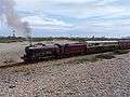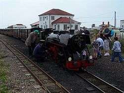 A train with the station buildings beyond. The platform ends just behind the locomotive. | |