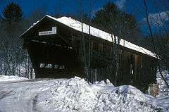 The Durgin Bridge is a covered bridge carrying Durgin Bridge Road over the Cold River in eastern Sandwich, New Hampshire. Built in 1869, it is a Paddleford truss bridge, with a total length of 110 feet (34 m) and a width of 19 feet (5.8 m). The span over the river is 96 feet (29 m) and the roadway width is now 14 feet (4.3 m), having been reduced from 16 feet by the addition of strengthening arches in 1966. The bridge rests on concrete-faced stone abutments. It is the fourth bridge known to be standing at the site, the first three having been washed away by spring floods. Jacob Berry, the builder, eliminated the central pier used by the earlier bridges, and raised the height of the bridge 10 feet (3.0 m). It is the only surviving 19th-century covered bridge in Sandwich.[2]