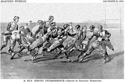 The 1885 season was notable for one of the most celebrated football plays of the 19th century – a 90-yard punt return by Henry "Tillie" Lamar of Princeton in the closing minutes of the game against Yale. Trailing 5–0, Princeton dropped two men back to receive a Yale punt. The punt glanced off one returner's shoulder and was caught by the other, Lamar, on the dead run.[32] Lamar streaked down the left sideline, until hemmed in by two Princeton players, then cut sharply to the middle of the field, ducking under their arms and breaking loose for the touchdown. After the controversy of a darkness-shortened Yale-Princeton championship game the year before that was ruled "no contest", a record crowd turned out for the 1885 game. For the first time, the game was played on one of the campuses instead of at a neutral site, and emerged as a major social event, attracting ladies to its audience as well as students and male spectators.[33] The Lamar punt return furnished the most spectacular ending to any football game played to that point, and did much to popularize the sport of college football to the general public.[34] One source lists Princeton captain C. M. DeCamp as the player of the year.[35]