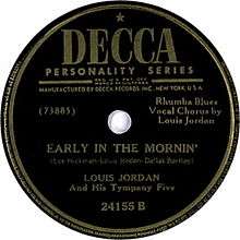 "Early in the Mornin'" or "'Early in the Morning" is a song that was recorded by Louis Jordan and His Tympany Five in 1947. It is an early example of a blues which incorporates Afro-Cuban rhythms and percussive instruments.[1] "Early in the Mornin'" became a hit, reaching number three in Billboard magazine's race records chart[2] and has been recorded by many different artists.