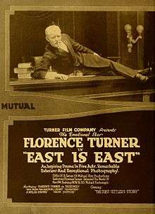 East Is East is a 1916 British silent film drama directed by Henry Edwards, who also starred in the film with Florence Turner. The film is an early example of the plot premise which would prove very popular in the British silent film canon: that of a character (almost always a pretty young girl) from the working-class East End of London being suddenly thrust by circumstance into the daunting milieu of West End high society.