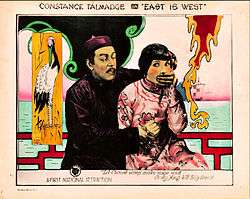 East Is West is an extant[1] 1922 American silent drama film directed by Sidney Franklin and starring Constance Talmadge.[2] The film is based on a 1918 Broadway stage play starring Fay Bainter as Ming Toy.[3] It was remade as a talkie at Universal in 1930 with Lupe Velez. A copy of the film is held at the EYE Film Institute Netherlands, formerly Filmmuseum Nederlands.