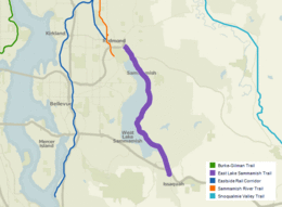 The East Lake Sammamish Trail is an 11-mile (18 km) recreational rail trail in King County, Washington that runs along Lake Sammamish from Marymoor Park in Redmond, through Sammamish, to Gilman Boulevard in Issaquah.