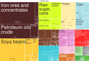 Export goods | transport equipment, iron ore, soybeans, footwear, coffee, automobiles |