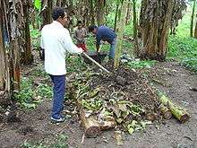 The Ecuador composting method is a common composting practice in the lowlands of Ecuador and Peru. The compost pile is embedded on the tree trunk or banana stalks, with a pale erected in the middle. Organic matter is placed in layers on the trunks or stalks, each layer being covered by mud, or inlaid via different types of organic matter. When the pile is about 1.2 meters high, it is watered and covered by big leaves. After some time, when the compost pile settles down, the central pale is removed for aeration. This composting method is typically done in a small-scale, by indigenous villagers.