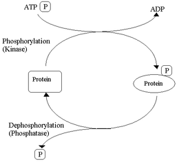 Explained simply reversible protein phosphorylation works like this: a protein kinase moves a phosphate group from adenosine triphosphate (ATP) to a protein. The shape and the function of the protein is altered enabling it to take part in some biological process. When the protein has completed its role a protein phosphatase removes the phosphate and the protein reverts to its original state. This cycle takes place to control an enormous number of metabolic processes.[10][11]