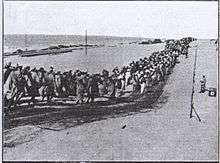 Beside the pipelines and the railway, hundreds of miles of wire netting roads were laid across the sand and pegged down, and great reservoirs, to hold huge quantities of water supplied by filters at a rate of 500,000 imperial gallons (2,000 m3) a day, were constructed. At the beginning of December 1916, the Egyptian Expeditionary Force had a ration strength of 150,000 British and 6,000 Indian troops, and 13,000 Egyptian labourers.[10][11]