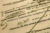 Although it was much broader, Eisenhower's speech is remembered primarily for its reference to the military-industrial complex.[6] The phrase gained acceptance during the Vietnam War era and 21st-century commentators have expressed the opinion that a number of the fears raised in his speech have come true.[8][9][10][11] The speech has been adapted as an oratory for orchestra and orator.[12]