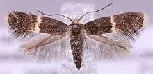 The wingspan is 9–11 millimetres (0.35–0.43 in). Adults are pale grey with a whitish head and a white transverse line across the center of the forewing. They are on wing from May to July and again in August in two generations per year.[2]