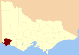 Being defined in the Victoria Constitution Act 1855[2] as "Bounded on the North by the Grange Burn and River Wannon until the latter joins the River Glenelg; on the West by the River Glenelg to the Sea; on the South by the Sea Shore to the Mouth of the River Shaw; and on the East by the Western Branch of the River Shaw to its Source ; thence by a Line North to the Source of the Swamp Creek; by that Creek to Mount Napier Swamp ; and thence by a Line North Six Miles Fifteen Chains to the Grange Burn, including the Laurence’s and Lady Julia Percy’s Islands, excepting the Country included in the Electoral District of Portland" Coordinates: 38°0′S 141°30′E / 38.000°S 141.500°E